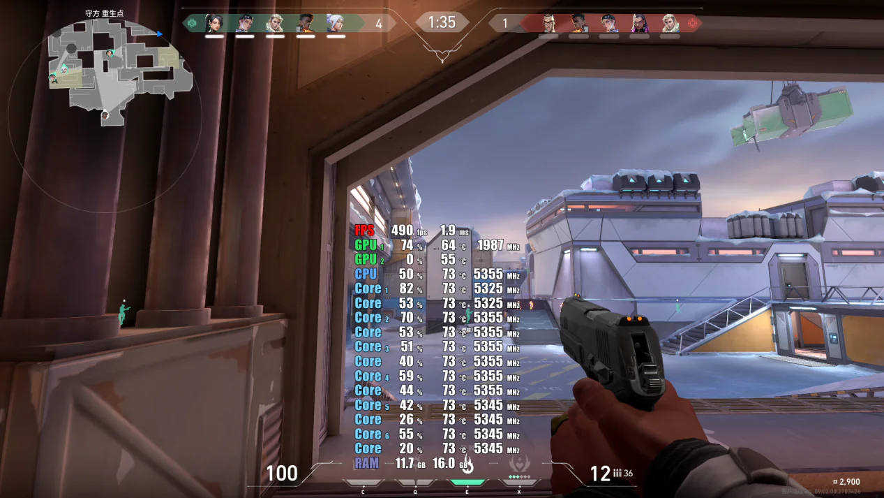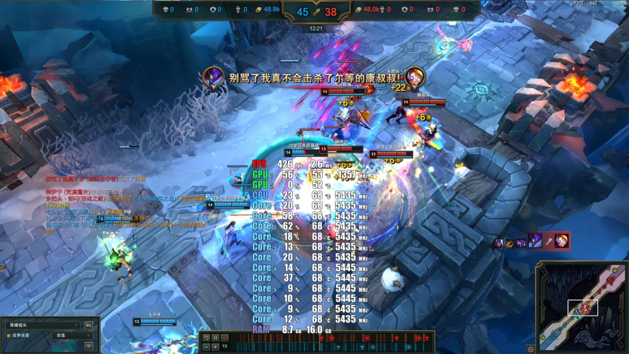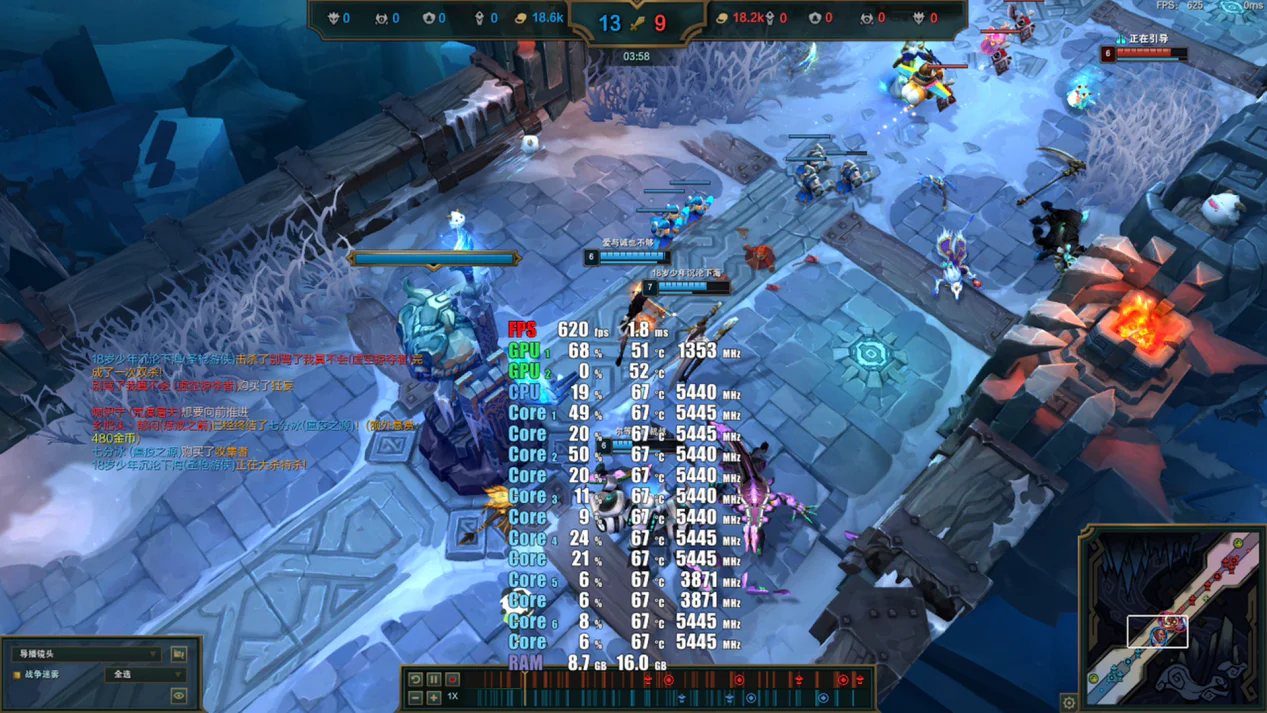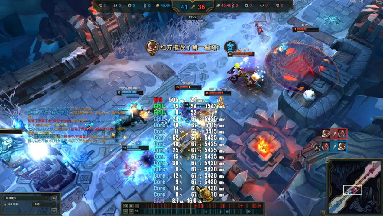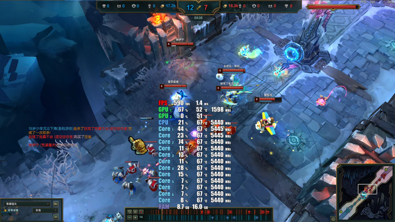 英雄聯盟中,我們使用一局遊戲的錄像回放,可以觀察到,即便是後期十人團站,特效全開的情況下,幀率依然保持在4,500幀以上。