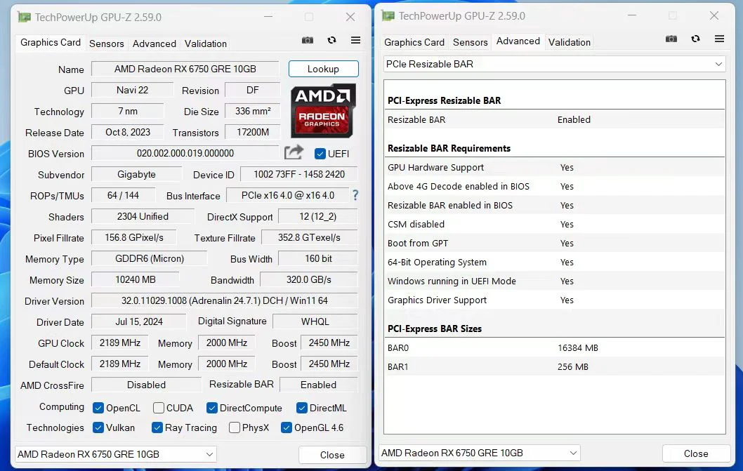 核心頻率2189MHz,加速頻率2450MHz,10G的GDDR6顯存,160bit,開啓Resizable BAR。