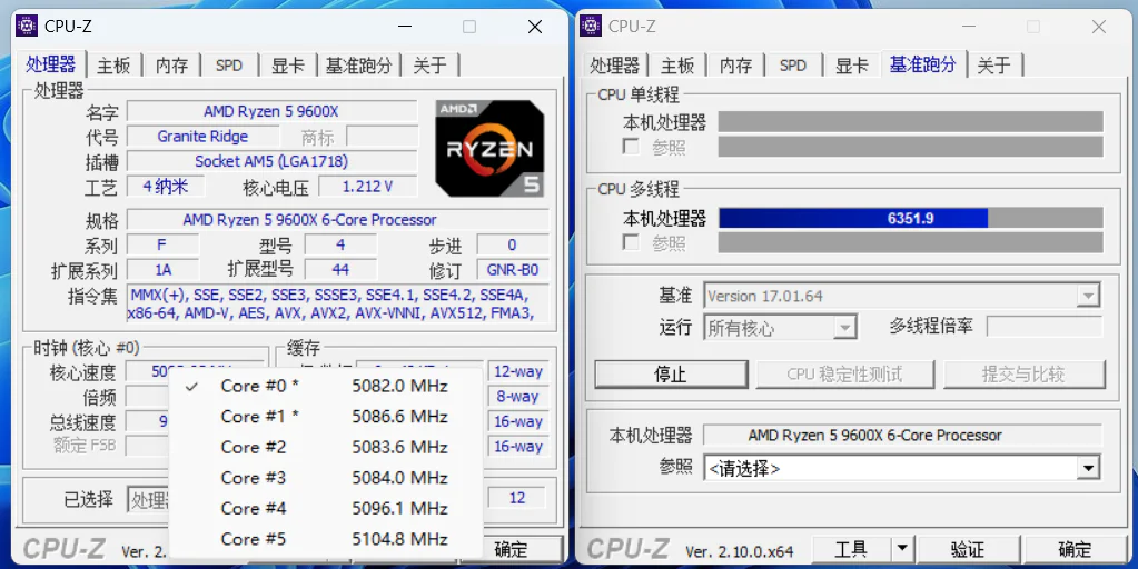 另外發現一個有趣的地方,R5 9600X在不同應用中的性能釋放(頻率)會有些許的不同,比如在跑CPU-Z的時候,全核心頻率5.1Ghz左右。(開了PBO)