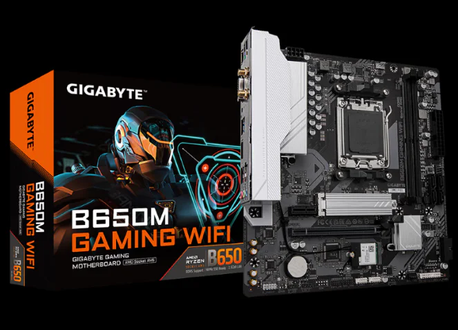主板搭配的是技嘉 B650M GAMING WIFI 魔鷹,供電方面5+2+2相,兩個DDR5內存插槽,M.2接口一個,配了Wi-Fi5藍牙4.2網卡,有線網卡爲2.5G,USB接口2.0兩個,3.2兩個,3.0兩個,一塊一線品牌裏頭普普通通的B650板子。接口不多但還算豐富。