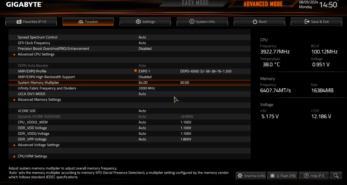 另外關於內存頻率,確實提升非常大,爲什麼選擇6000Mhz頻率的內存給大家超頻到6400Mhz測試,第一是因爲確實小超一下內存在這一代處理器上來說非常的簡單,甚至內存能輕鬆上到8000頻率。綜合了6000 6400 6600 6800頻率的效能和價格,最後搭配的是性能不弱,性價比更高的6000內存超頻到6400。這一代銳龍的內存效能甜點也在6400Mhz左右。