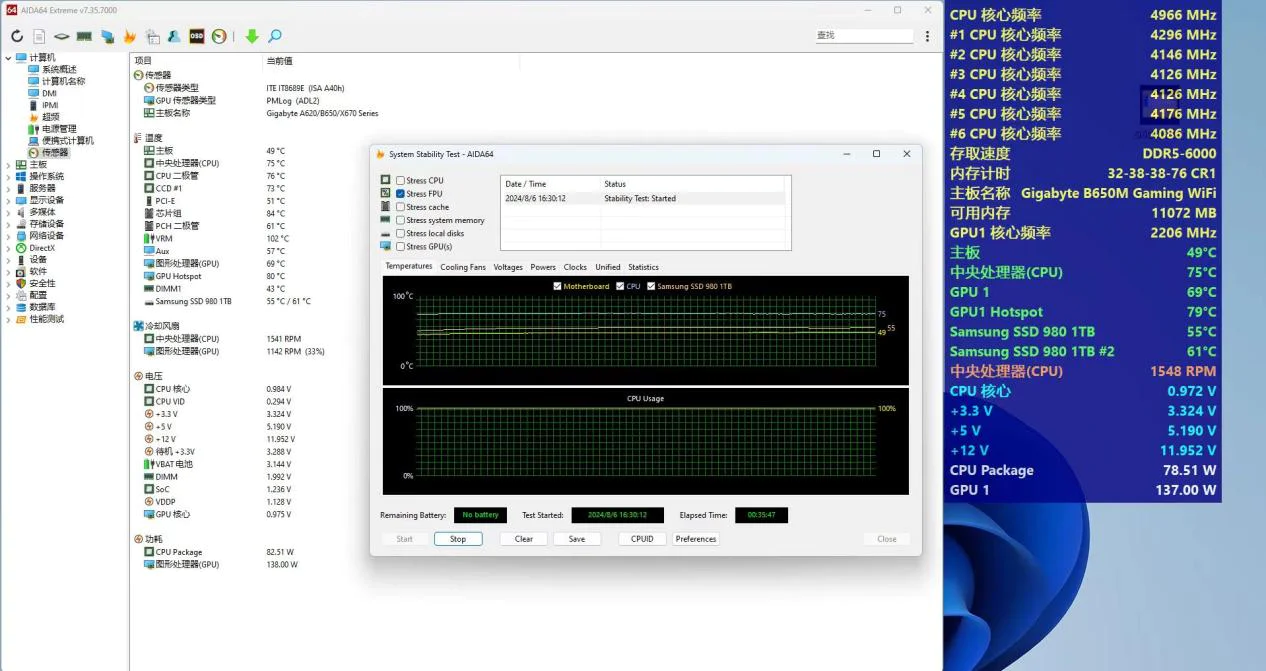 CPU頻率4.1Ghz,功耗86瓦左右,核心溫度76攝氏度,顯卡溫度69℃,核心頻率2200Mhz左右,功耗138瓦,此時整機的功耗312瓦。整體表現非常的穩定,溫度特別低,特別是CPU,在這之前,大家很少見過烤機80℃以下的銳龍處理器吧,特別是開啓了PBO的情況下。
