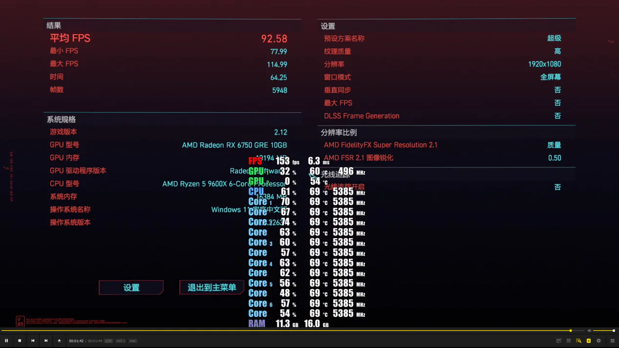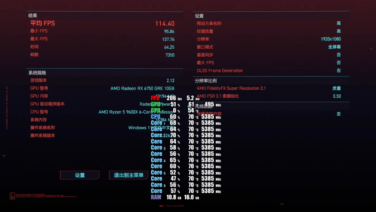 在顯卡殺手2077中,我們測試了中高超高畫質下的性能表現,幀率分別是137,114以及92幀,即使是中畫質,2077也有非常不錯的畫面感。同樣可以無腦去搭配1080P 144Hz高刷顯示器。