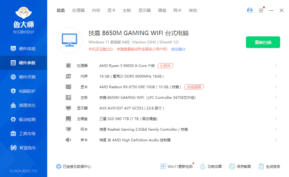 CPU方面選擇的是AMD 9000系列 銳龍5 9600X 6核心12線程,基於目前AMD最先進的Zen 5架構打造,有着最先新的4nm製程工藝,相比較7000系列的銳龍5 7600X加速頻率提高0.1Ghz,達到了5.4Ghz,L1緩存從384KB變成了480KB,L2和L3都沒有變化,還是6MB和32MB,TDP從105W降低到了65W,得益於工藝升級,架構升級,紙面參數看上去是性能提升,功耗降低,擁有更好的能耗比,另外自帶核顯的優良傳統也是保留了下來。