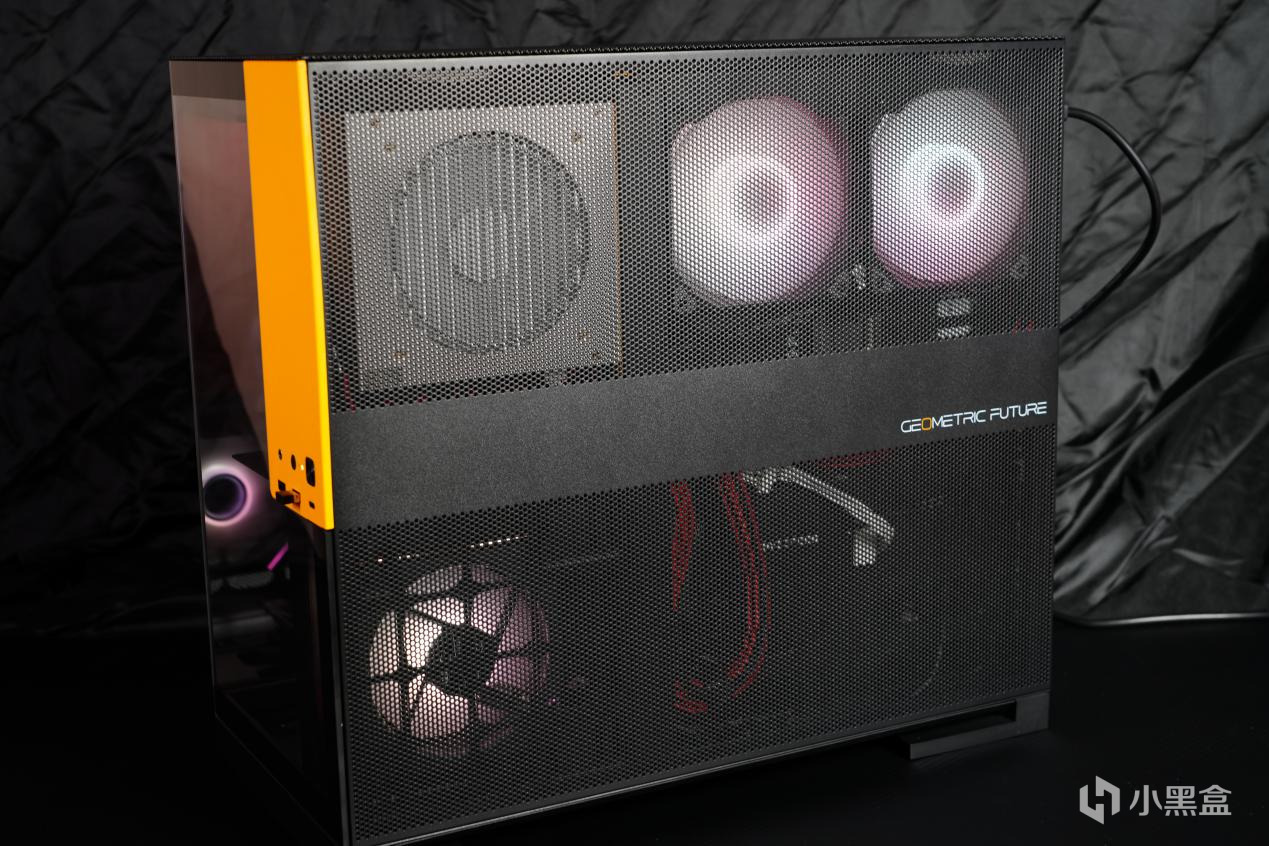 除開前面板&側面爲全景玻璃外,其頂部、背部、後部均有大面積網孔,就連電源風扇都可以看到。