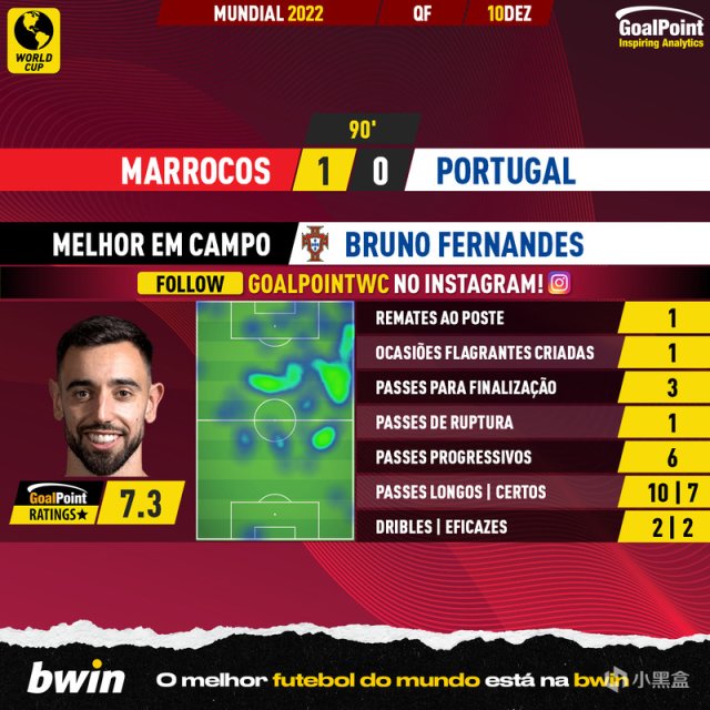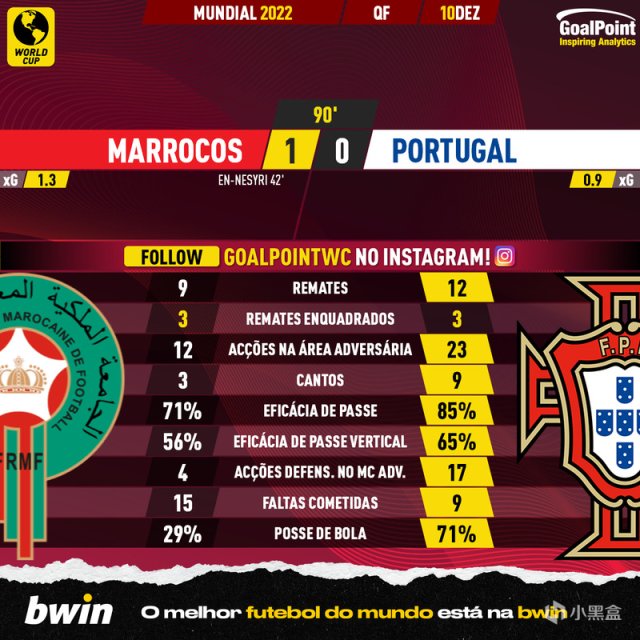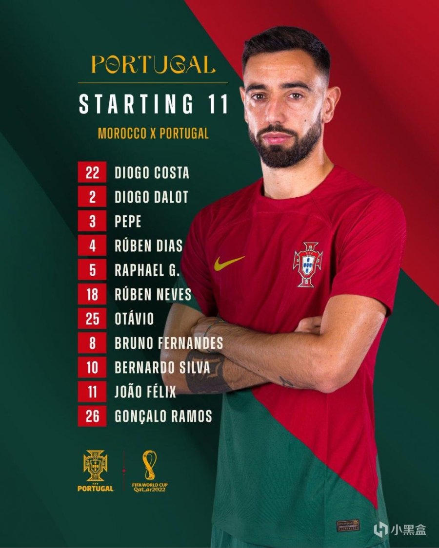 第70分鐘,萊奧左路帶球被鏟,達裏染黃!第77分鐘,達洛特身體不適,裏卡多-奧爾塔將其換下,摩洛哥這邊阿布哈拉勒和賈布拉內換下齊耶赫和鮑法爾!第82分鐘,菲利克斯打門被布努用手托出!第87分鐘,埃爾亞米克禁區內疑似手球,裁判沒有表示!第90分鐘,C羅高速啓動接到隊友直塞,單刀機會被布努撲出!第90+1分鐘,謝迪拉兩黃變一紅被罰下!第90+5分鐘,摩洛哥反擊被科斯塔出擊化解!第90+7分鐘,佩佩頭球頂偏,沒能抓住扳平機會,摩洛哥 1-0 戰勝葡萄牙,挺進四強!