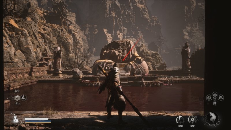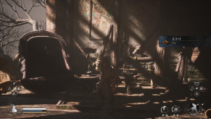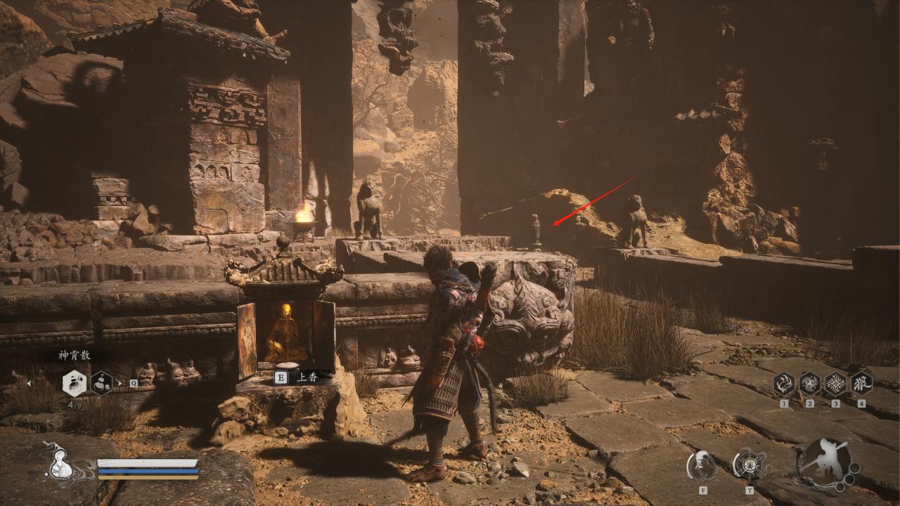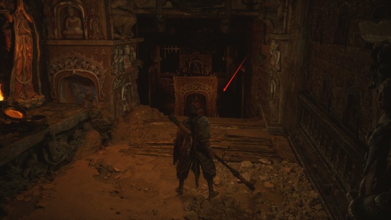 玩家在通關第二個守關boss虎先鋒後,虎先鋒身後的臺子上會後有一個佛像,如下圖(臥虎寺-寺門,向上走在和虎先鋒交戰的位置),玩家在後續擊敗石先鋒可以獲得石之厲,隨後可以通過土地廟遠遁回來,解鎖這個隱藏地圖。