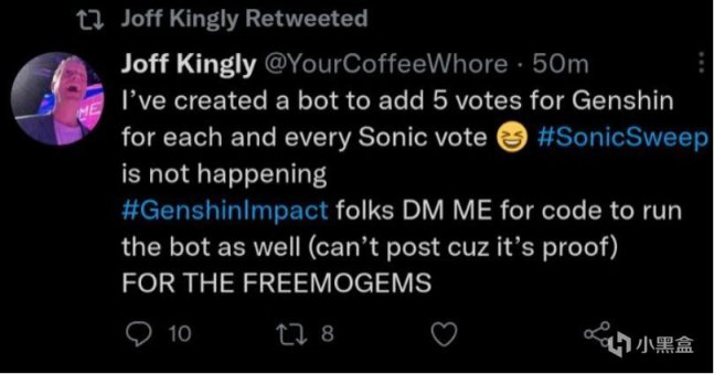 事情到這還沒結束,前天,一名《索尼克》玩家突然在推特上發表聲明:自己用機器爲《索尼克》刷票,並且成功了。他在短短15分鐘裏,就爲《索尼克》刷了整整1w票。