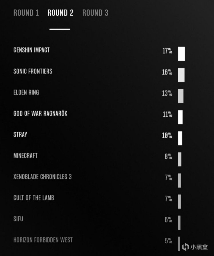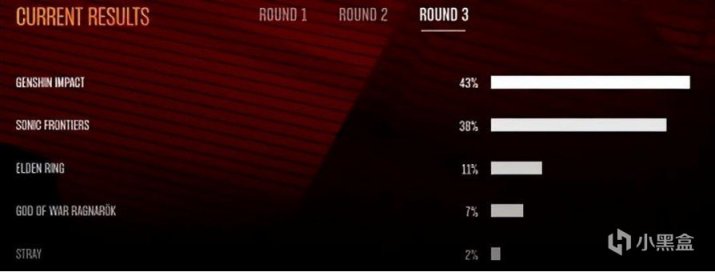 在一個禮拜前的第一輪投票,《老頭環》和《戰神》就以9%的投票率並列第一。《索尼克》則以8%的投票率緊隨其後。而《原神》則是以吊車尾的成績堪堪及格,進入了下一輪的評選。
