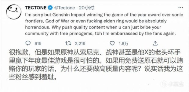 隨着這個觀點的提出,越來越多的人開始指責《原神》玩家的社區羣體,破壞了這個獎項的公允。隨着聲討的聲音逐漸增大,有人直接自報家門,表示自己給《原神》刷了票。