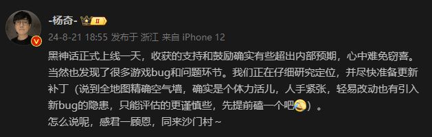 《黑神话:悟空》发售后的第二天,美术总监杨奇发文表示当前收获的支持和鼓励确实有些超出内部预期,心中难免窃喜。同时还简单介绍了游戏未来的更新目标,杨奇表示目前发现了很多游戏bug和问题环节,团队正在仔细研究定位,并尽快准备更新补丁。