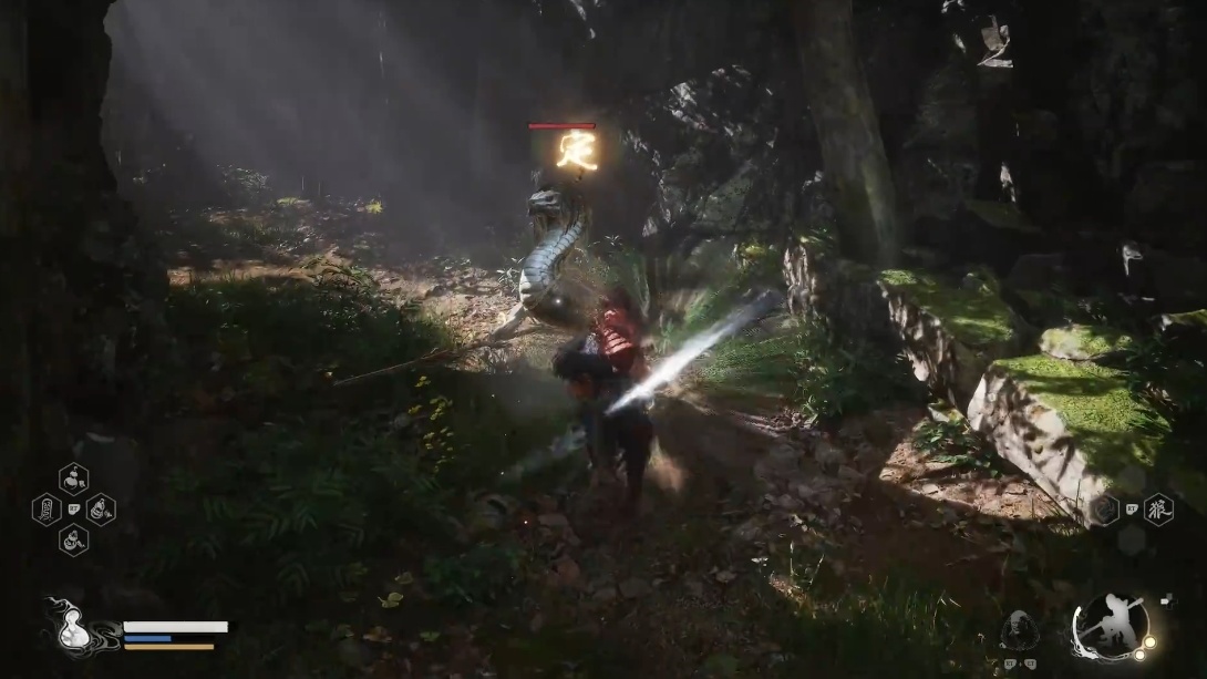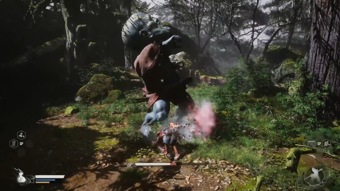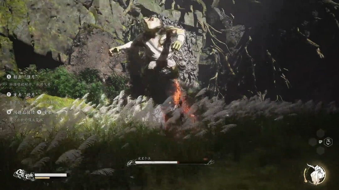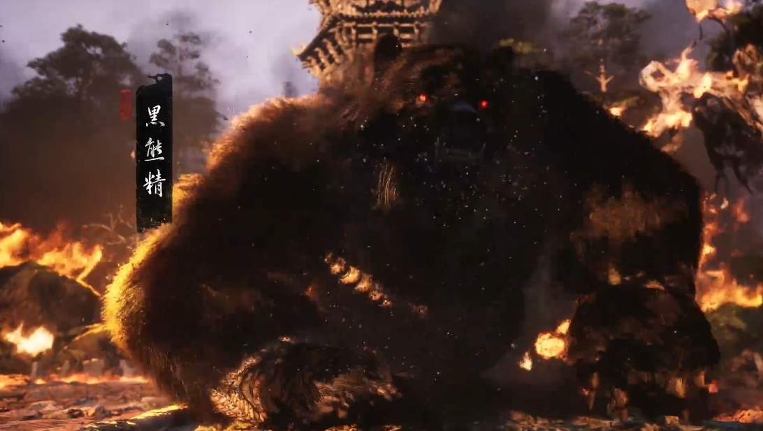 來到山頂就會遇到妖怪形態的黑風大王了,在半血的時候會進入火附魔狀態。
