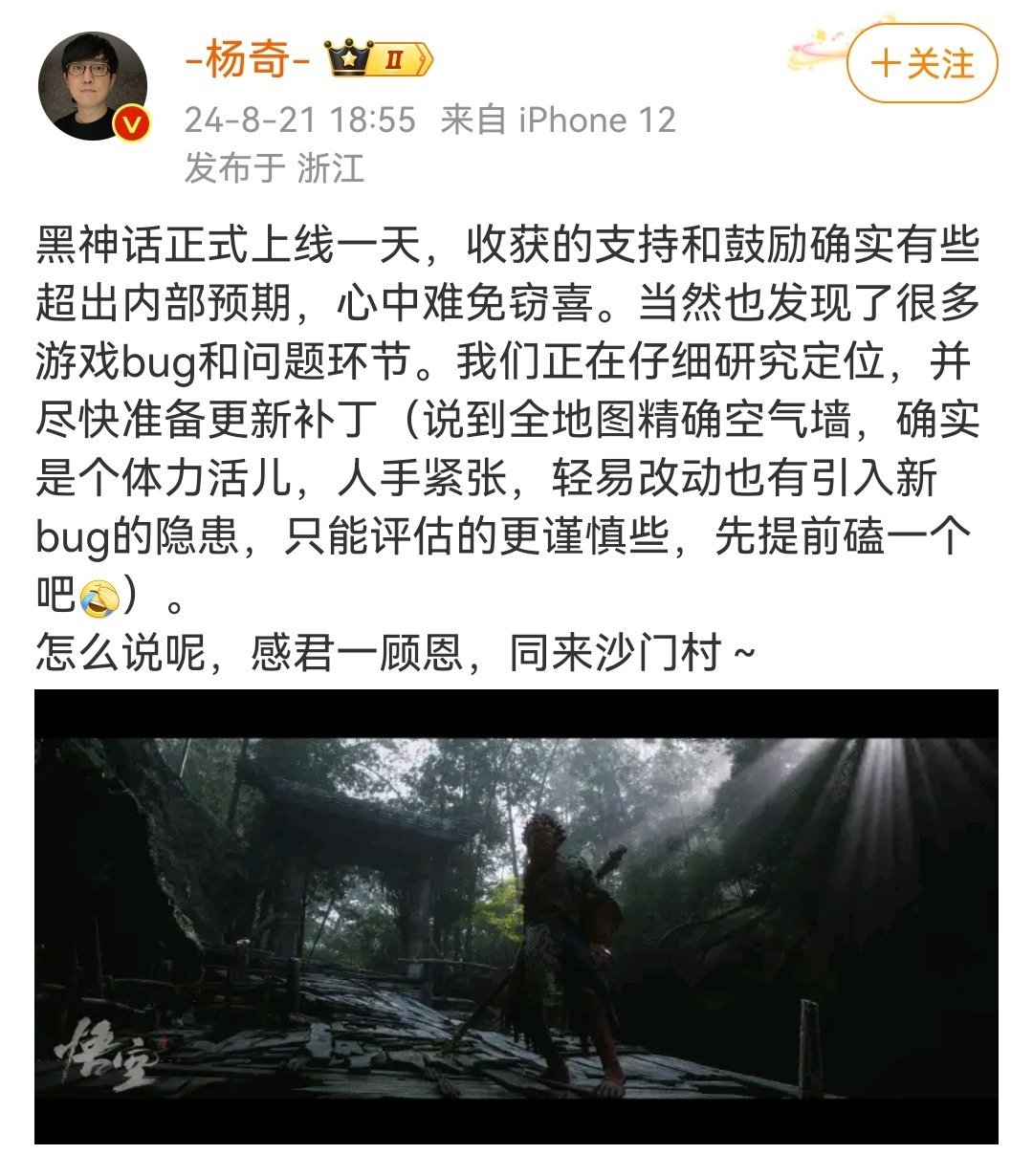 今天,《黑神话:悟空》制作人杨奇在某博发文感谢玩家们超出预期的支持和鼓励,并回应了游戏的bug问题,他表示: