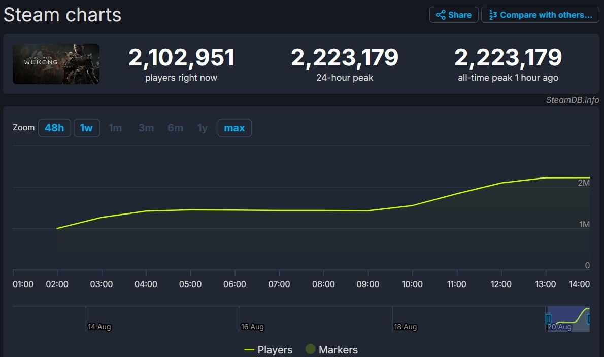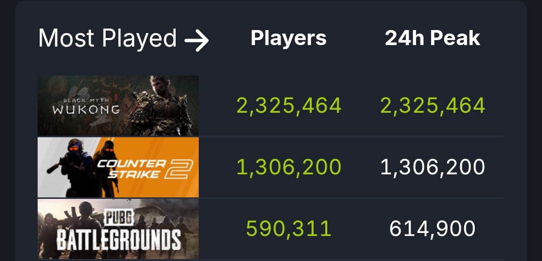 在20号晚上,《黑神话:悟空》获得steam单机游戏在线人数第一,同时也超越steam历史在线游玩人数排名第二的《幻兽帕鲁》,成为榜二!