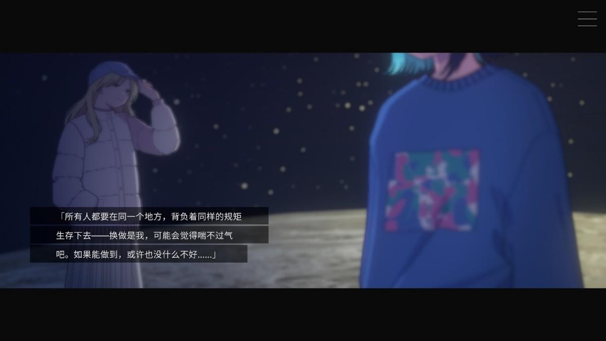 游戏节奏很慢,并且非常慢热,如果对得上电波的人会认为是享受,而对不上电波恐怕就会觉得看得云里雾里了。与一般视觉小说的插图加对话框UI的形式不同,《Moonless Moon》以类似音乐PV的形式,直接在画面上浮现出两边的对话,将文字与画面融为一体,初见确实很有新奇感。