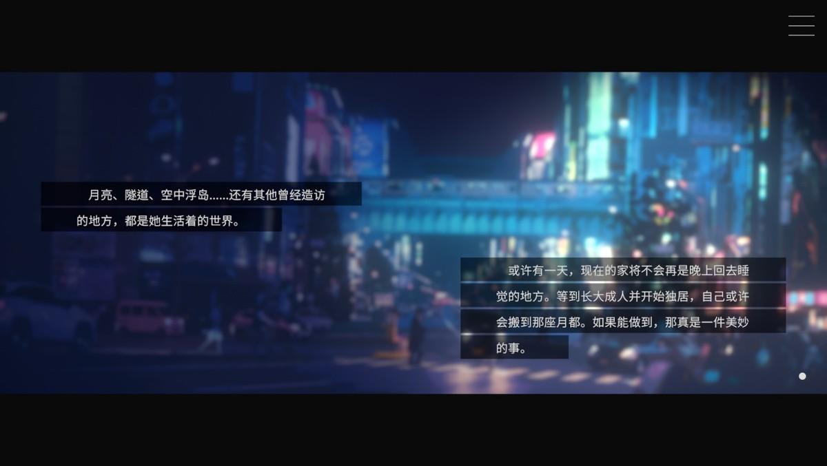 走到哪里便想到哪里,然后想象力就能无限延伸出去,这是我在体验《Moonless Moon》时的感受。世界对夜蕗来说总是突然消失,又突然再出现,如果她不想进入异世界,就可以在自己的世界里做些使自己忙碌的事情,然后早早休息, 但这样的生活过久了也会让人想有逃出去的冲动。