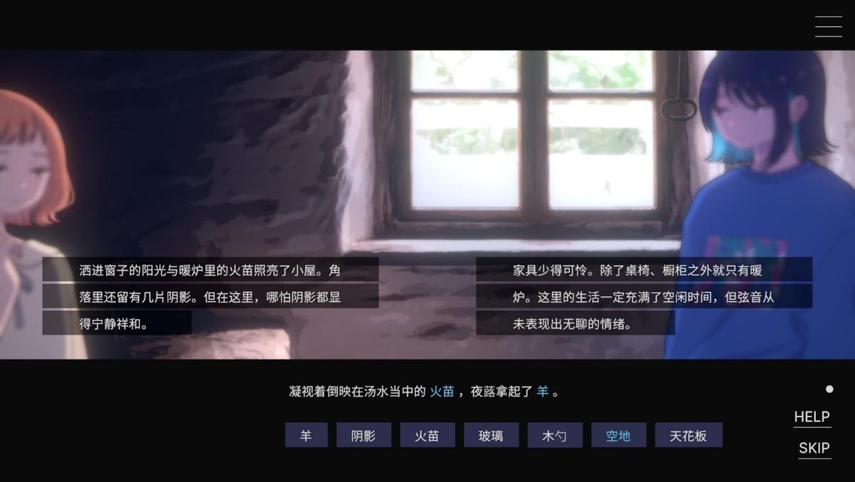在游戏过程中,经常会出现填空环节。玩家可以在对话中寻找到关键词以及可以延伸的对话,通过对话获得线索,再将正确的关键词填到空白上,以解锁剧情,虽然乱填可能看上去很搞笑,但并不会解锁剧情哦。在游戏的后日谈中,四个关键词分别对应四种结局,但其实它们之间并不冲突,是并列存在的短暂故事终末。