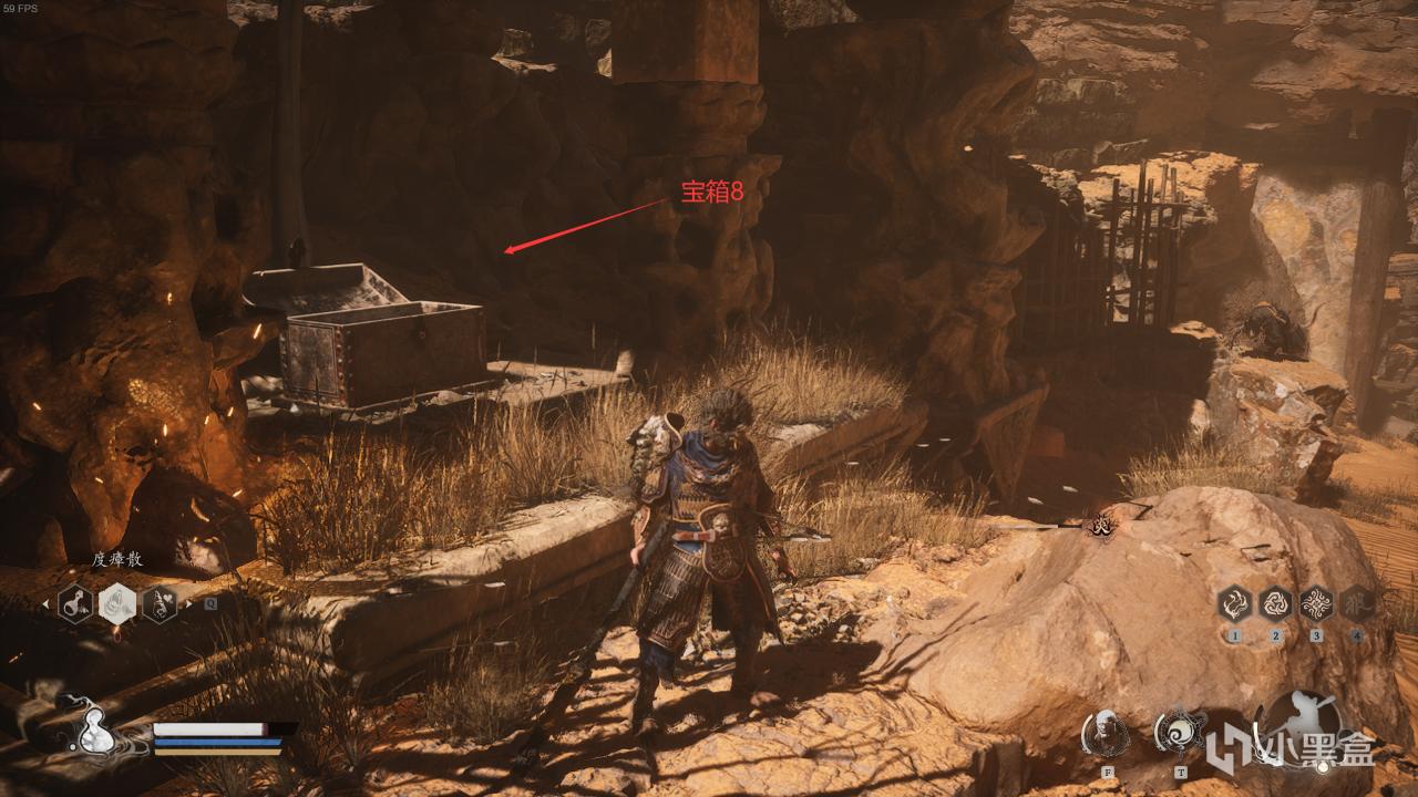 寶箱14:從黃風陣(定風莊)土地廟出發,在虎倀BOSS戰橋前空地,棺材形寶箱。