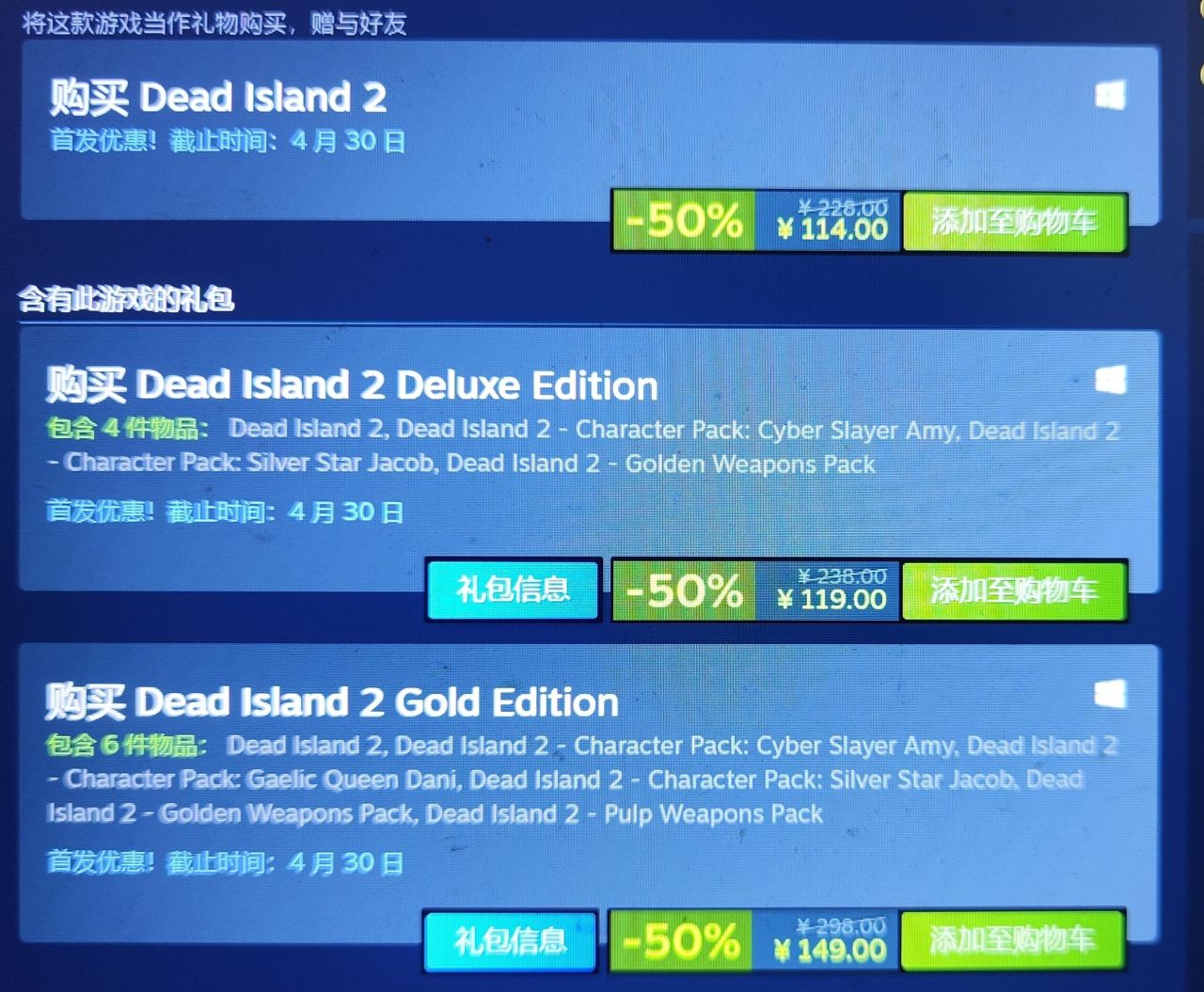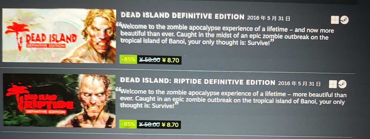 之前steam送过死亡岛激流终极版,听说不错,不过要打中文补丁,还有一个是死亡岛终极版,除了剧情不一样,其他都一样,包括2代的好评也非常多。