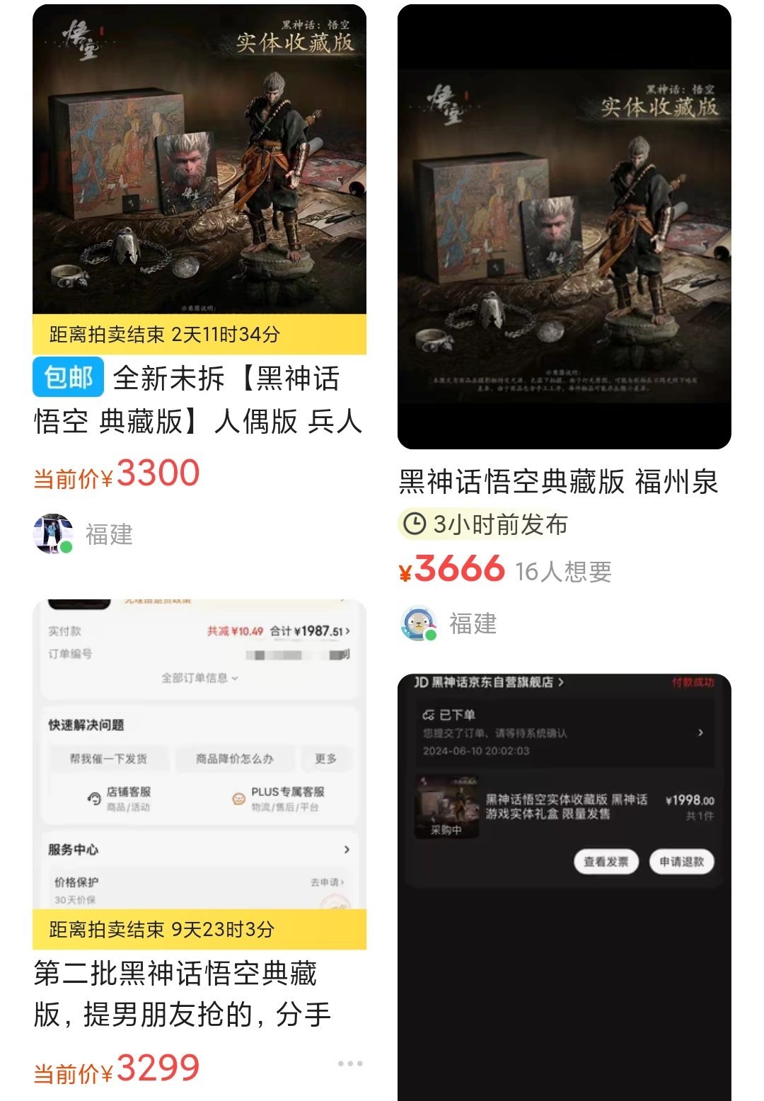 目前,闲鱼上已经开始上架了大量的黑神话典藏版,只是实体的价格和原售价已经天差地别,有的物品价格甚至上升了一倍有余。998的卖两三千,而更贵的典藏版甚至直接来到了三四千元的价位。