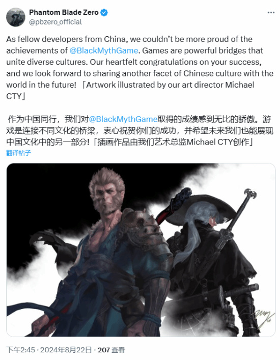 國產武俠遊戲《影之刃零》官推今日發推,對《黑神話:悟空》表示了祝賀,推文中寫道:“作爲中國同行,我們對《黑神話:悟空》取得的成績感到無比的驕傲。遊戲是連接不同文化的橋樑,衷心祝賀你們的成功,並希望未來我們也能展現中國文化中的另一部分!插畫作品由我們藝術總監Michael CTY創作。”