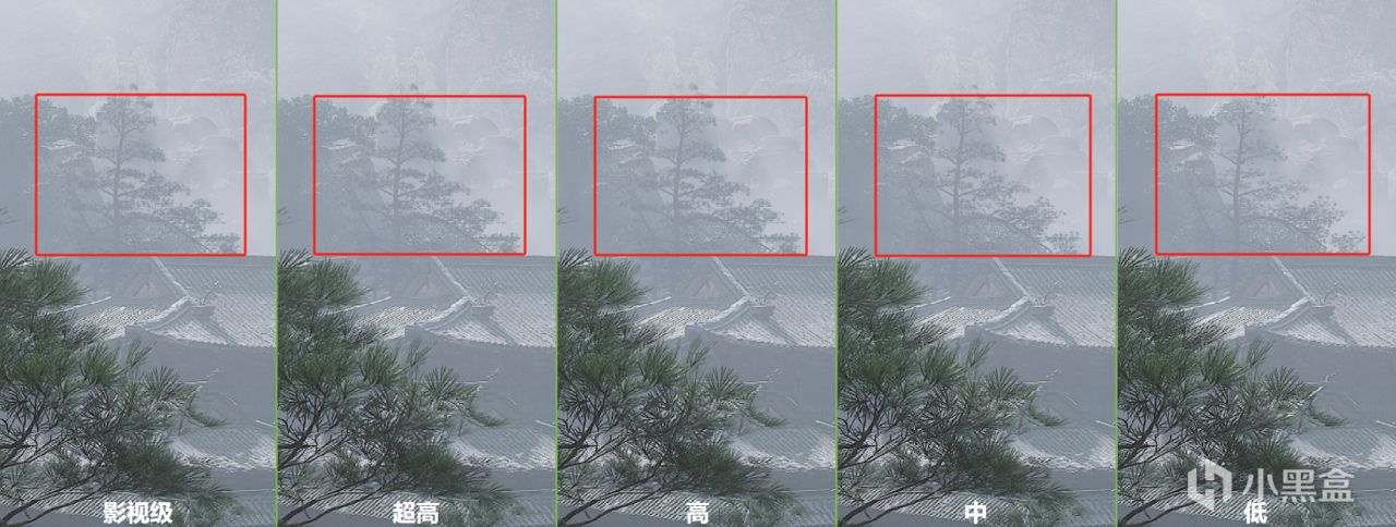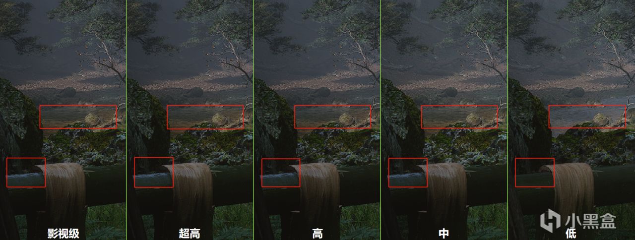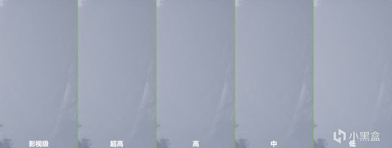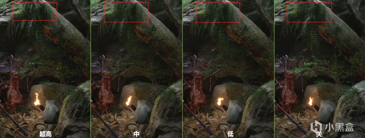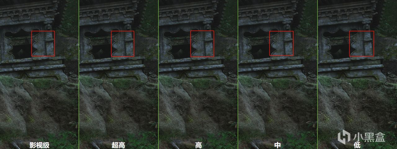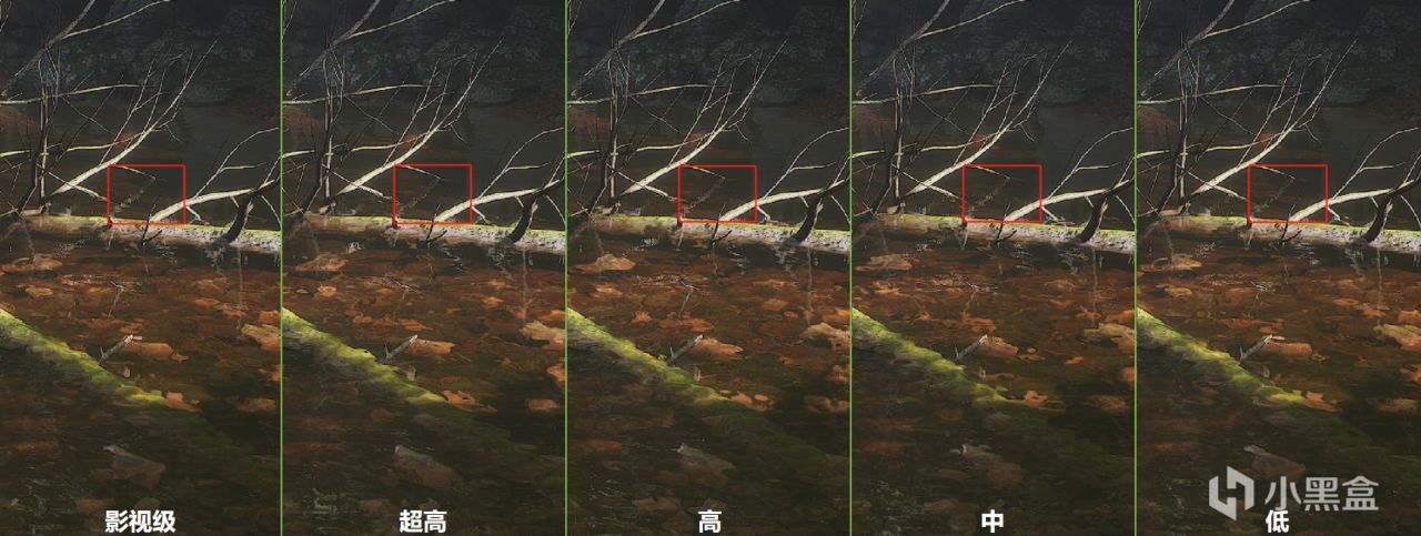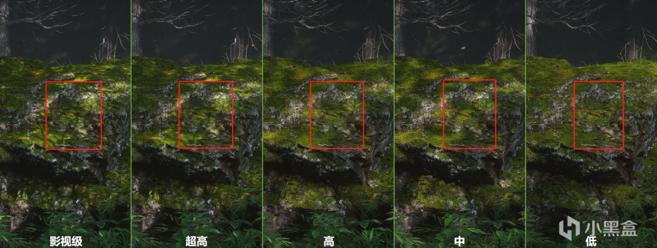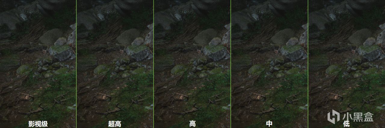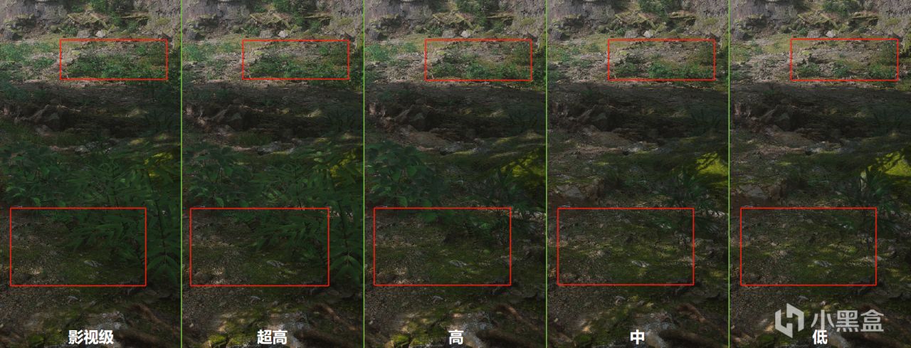 低到中的區別最明顯,陰影從無到有。從精細化的程度來看,高到超高的區別其次,陰影效果有了明顯的提升。除了石頭表面的陰影,其後方的密林深處也存在差異。