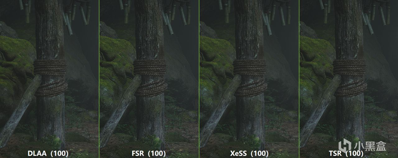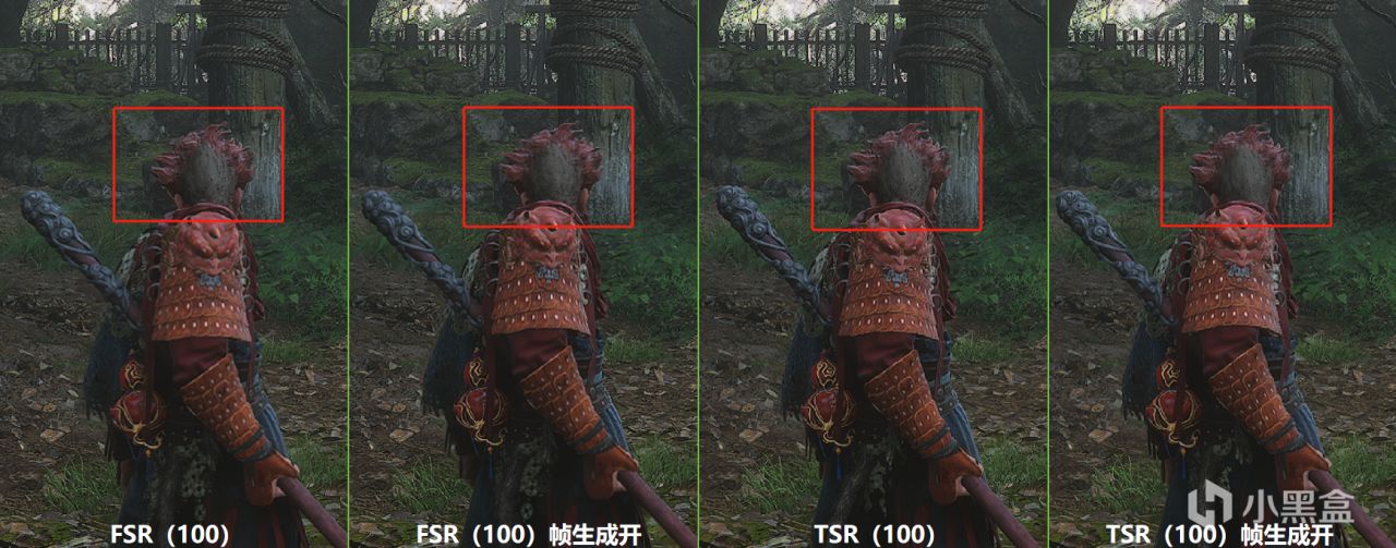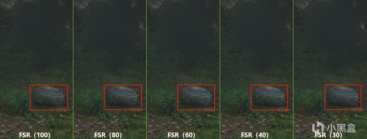 FSR的效果更偏向於銳利,畫面顆粒度會高一些。越靠近FSR(100)畫面越銳利,反之則越柔和,但同時會損失一些細節。圖中石臺的圓盤邊緣和臺身的紋理可以充分說明這點。