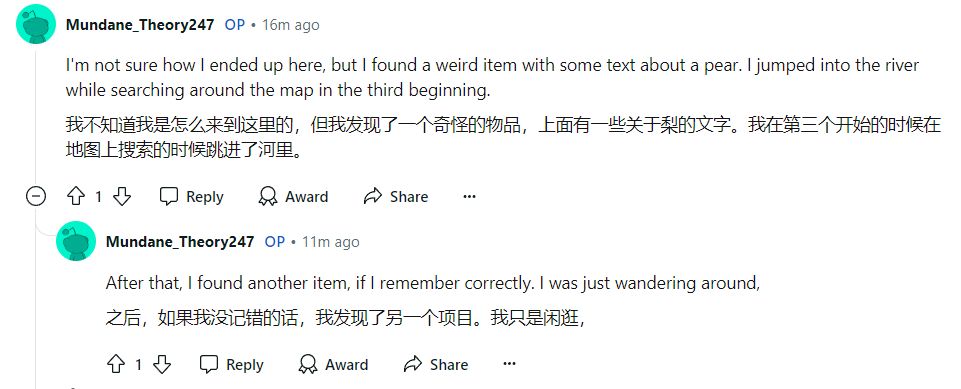 随后这位贴主继续发文,说自己也不知道怎么来到这里的,他发现了一个奇怪的物品,上面有一些关于梨的文字,他在第三次开始的时候在地图上探索时跳进了河里,然后就发现了另一个物品