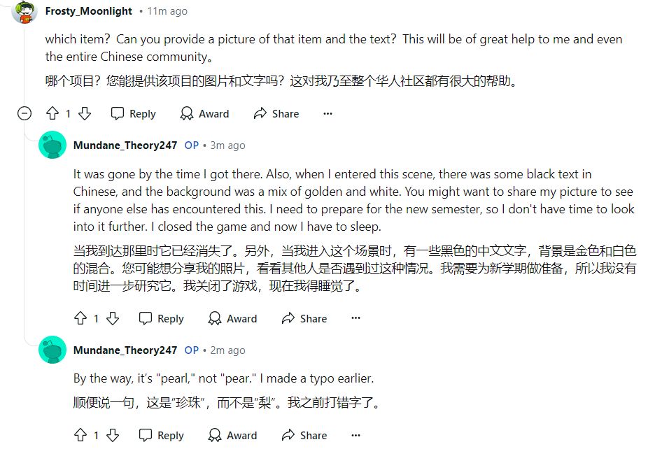 他后面继续补充说,他到达那里的时候它已经消失了。另外,当他进入这个场景时,有一些黑色的汉字,背景是金色和白色的混合。顺便说一句,那个物品是“珍珠”(pearl),而不是“梨”(pear),他之前打错字了