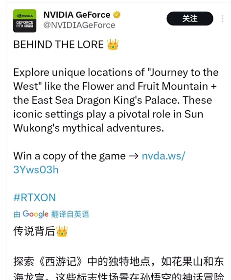 这也和英伟达官推之前的推文一致,说玩家可以在游戏中探索花果山和东海龙宫