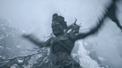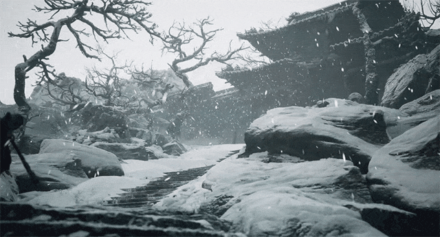 時而遊走在遍地的黃沙之間,頭頂一破瓦頹垣的寺廟,輕微拂去的經文與香火能瞥見其昔日的風光無限;時而着落在蒼翠欲滴的樹林,筆直的竹竿和一地的綠葉會隨着棍棒的起舞隨風漂泊;時而又來到了茫茫無際的雪原,盤根錯節、凌空欲飛的浮屠塔,獨釣寒江雪的青背之龍,蕩氣迴腸、情同手足的龜蛇二將,都被前來索命的天命人攪得地動山搖,又不禁拖着風燭殘年的身軀潸然淚下。