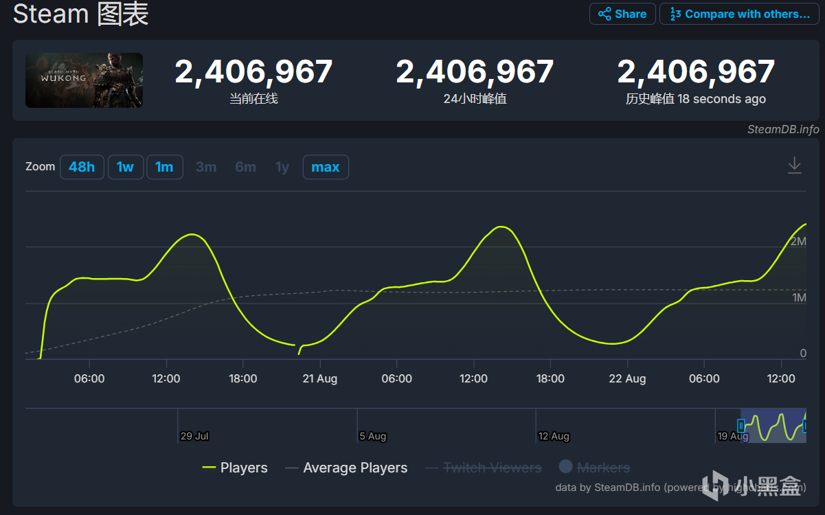 今晚,《黑神話:悟空》在Steam平臺上的在線人數峯值再次迎來突破,從昨日的235萬上升至240萬!這一成績讓《黑神話:悟空》穩居Steam歷史在線峯值第二的位置,超越了包括《幻獸帕魯》、《CS2》在內的多款熱門遊戲。