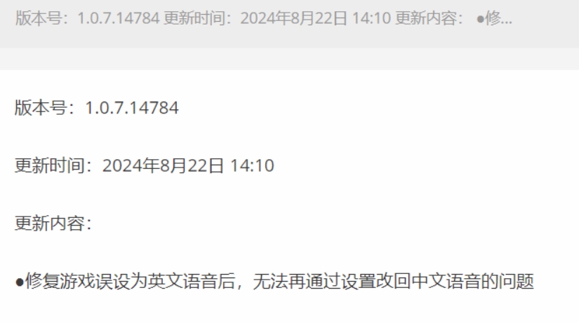 今日,《黑神话:悟空》发布了 v.1.0.7.14784 版本补丁,主要修复了玩家将游戏设为英文语音后,无法再通过设置改回中文语音的问题:
