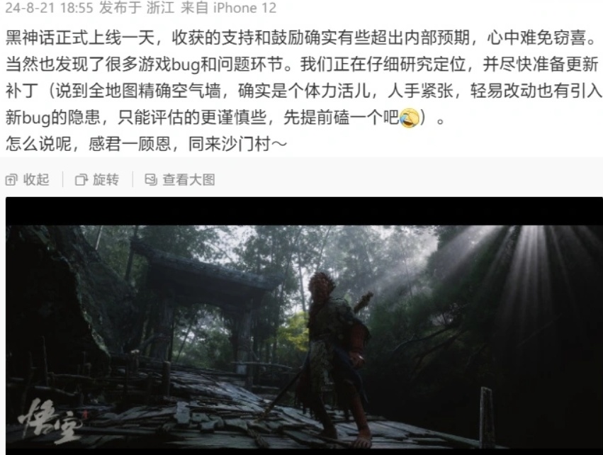 游戏科学联合创始人杨奇也在昨日发文表示,针对《黑神话:悟空》目前的已知 BUG,他们将尽快准备游戏的更新补丁。