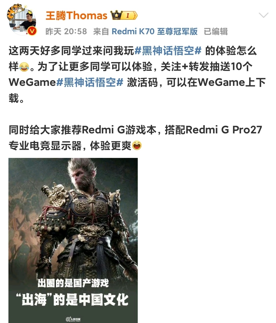 昨天晚上,紅米總經理王騰再次發佈微博稱,最近有許多同學來問我黑神話悟空的體驗怎麼樣?口說無憑,爲了讓大家更好的體驗。所以免費抽取十個玩家贈送激活碼。
