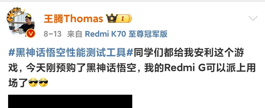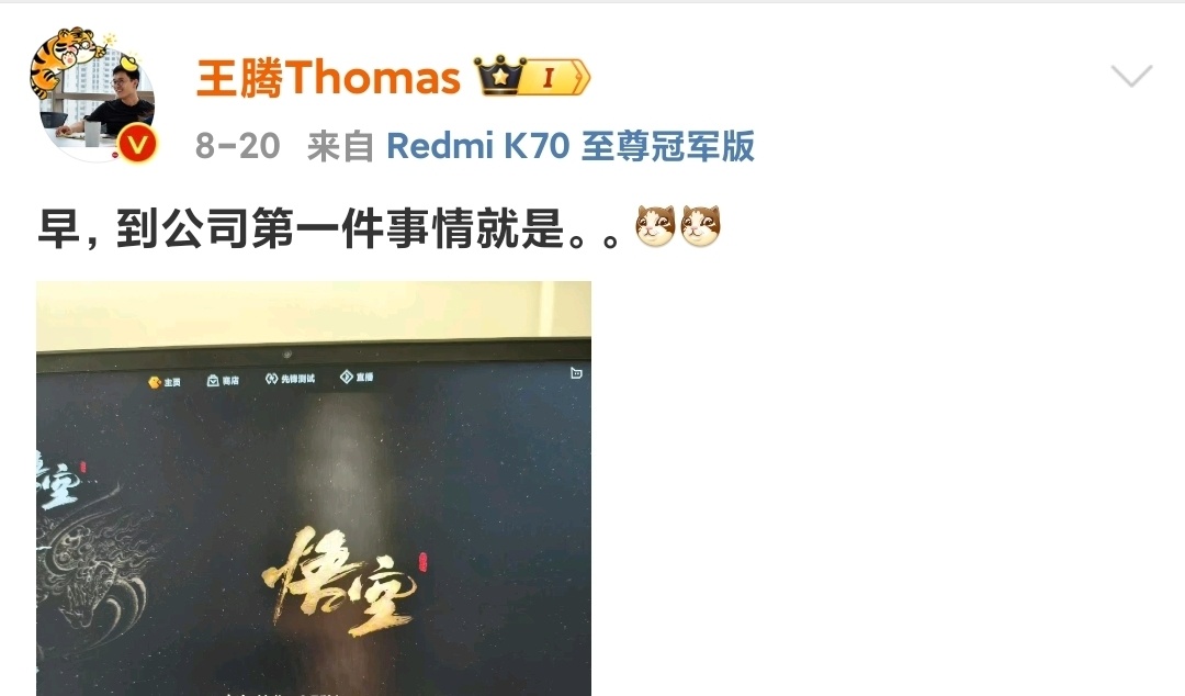 故事的開始,誰也沒有想到會有這麼多的曲折。黑神話性能測試工具發佈的時候,紅米總經理王騰就曾經提出,用自己的紅米筆記本測試來測試一下游戲,等到遊戲正式發售那一天。王騰也秀出了自己的遊戲截圖,這個時候還在上班的,大家自然是羨慕不已,於是有人就把王騰偷玩黑神話的消息同樣傳達給了正在上班的小米老闆雷軍(開玩笑)。