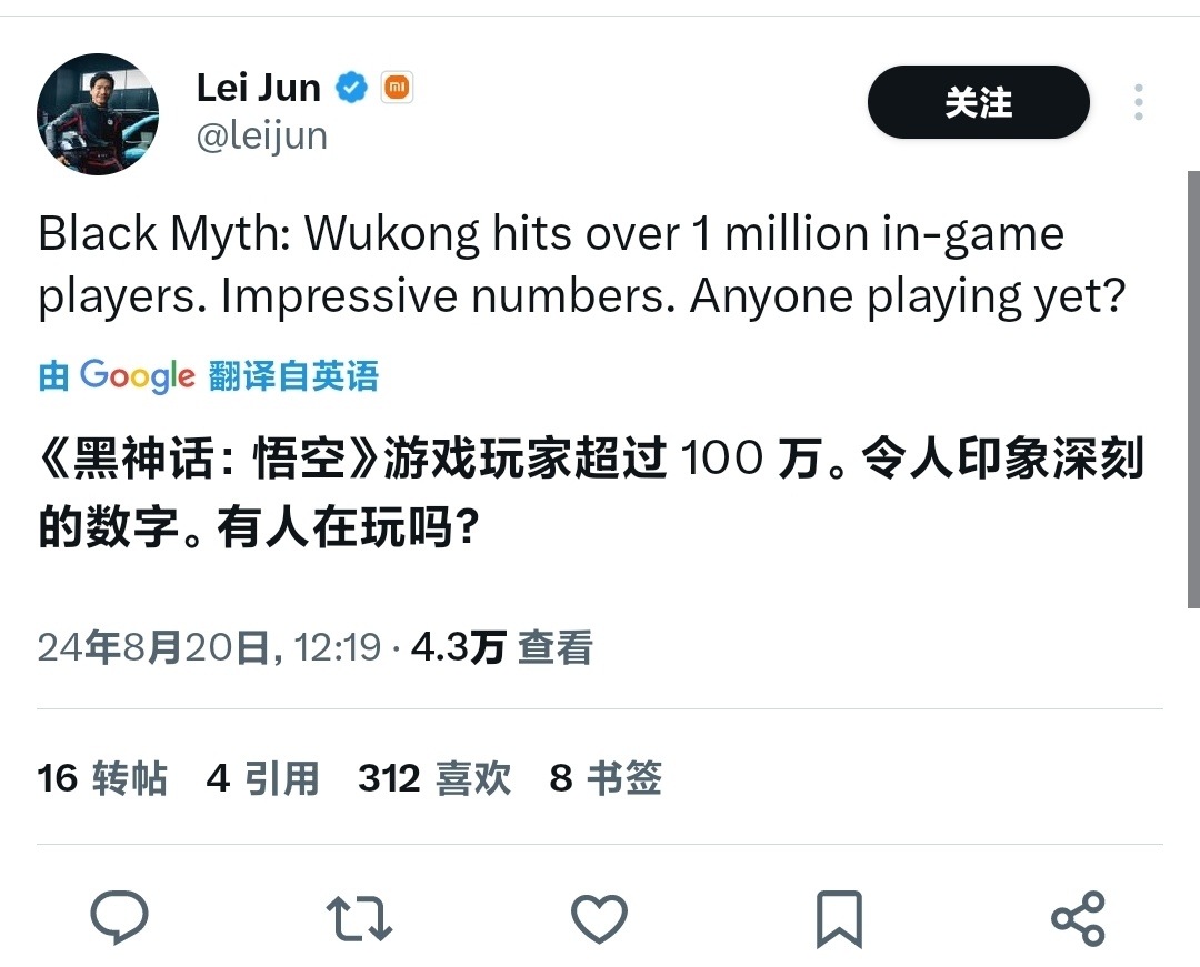 雷軍這時候也在關注着黑神話。在8月20日當天,雷軍也曾發佈推文,問大家瞭解這部百萬玩家在線的黑神話悟空嗎?評論區自然是紛紛秀出了自己的黑神話。而在今天的採訪中,雷軍談王騰偷玩黑神話的事情,表示小米的公司制度比較寬鬆,另外自己從小時候開始就也喜歡玩遊戲來放鬆心情。而且王騰也說了,是在測試自己筆記本的性能。