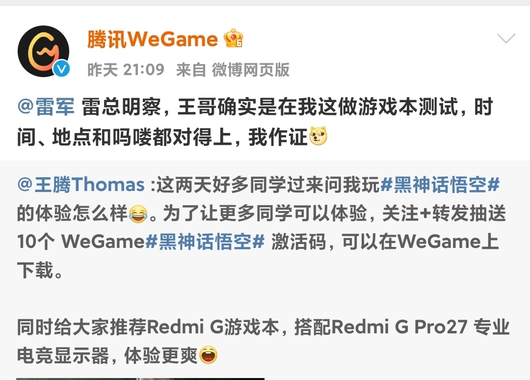 這麼好的免費廣告,不要白不要。於是wegame平臺官方也發佈微博回應道:雷總明察,王哥確實是在我這做遊戲本測試,時間、地點和嗎嘍都對得上,我作證!