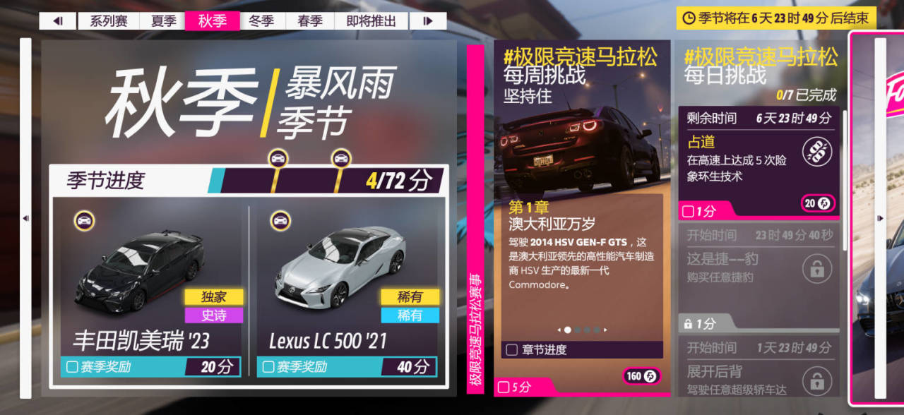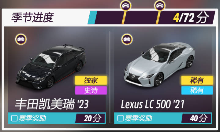 秋季赛20分进度奖励为2023款丰田 凯美瑞和40分进度奖励为2021款LEXUS LC 500