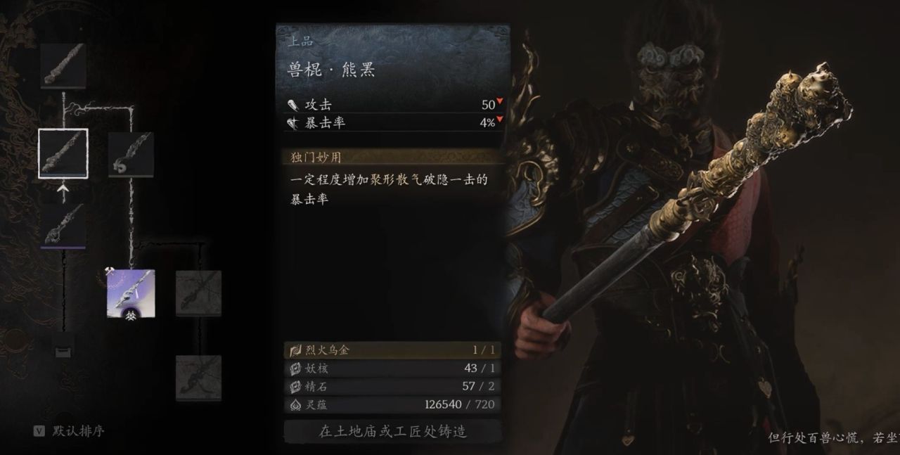 继续主线剧情,成功击败第一回的最终BOSS黑熊精,将获得烈火乌金材料,用于解锁新的铸造选项。
