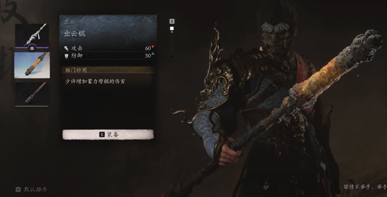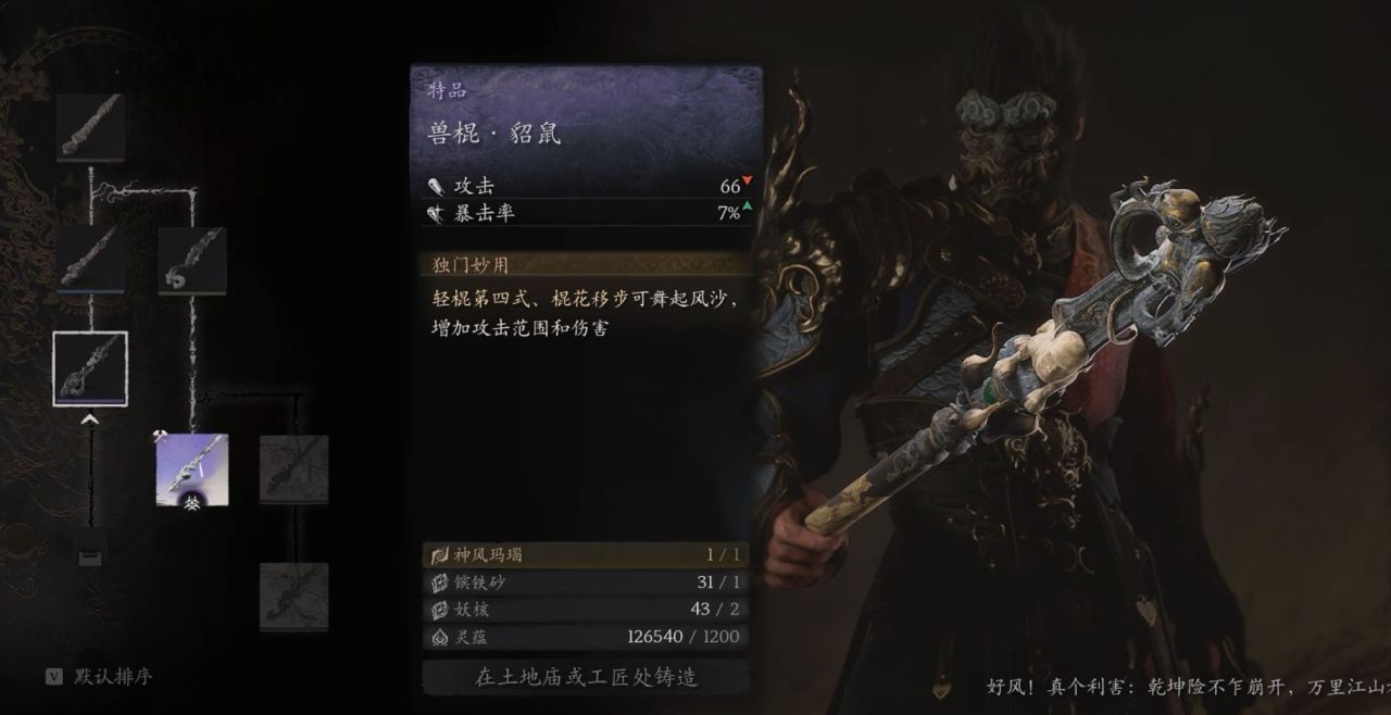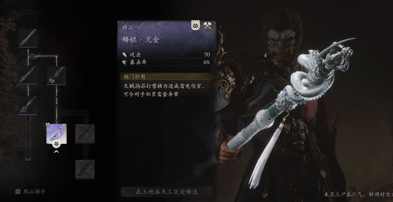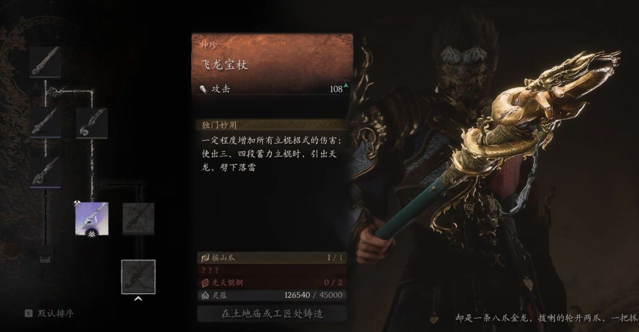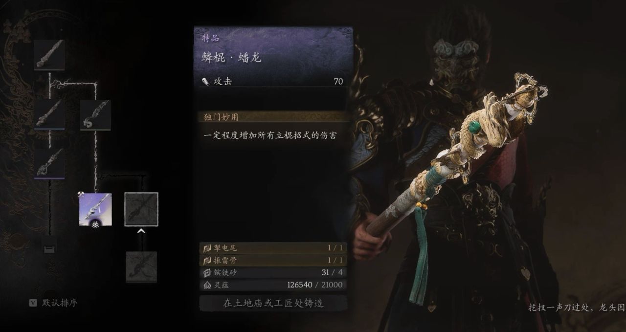 省流:凡品-柳木棍、良品-铜云棒、良品-鳞棍·双蛇、上品-兽棍·熊罴、上品-出云棍、特品-鳞棍·蟠龙、特品-兽棍·貂鼠、特品-鳞棍·亢金、特品-楮白枪、神珍-飞龙宝杖、仙品-狼牙棒