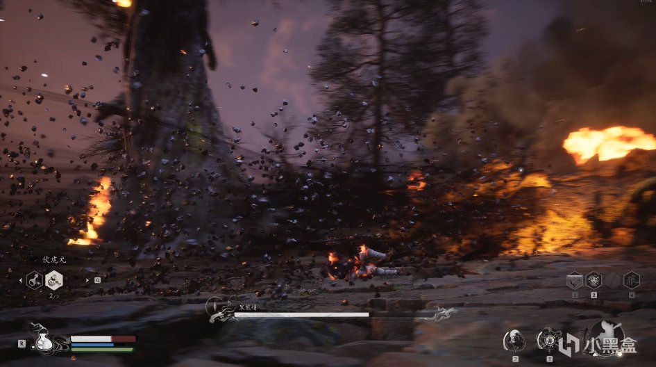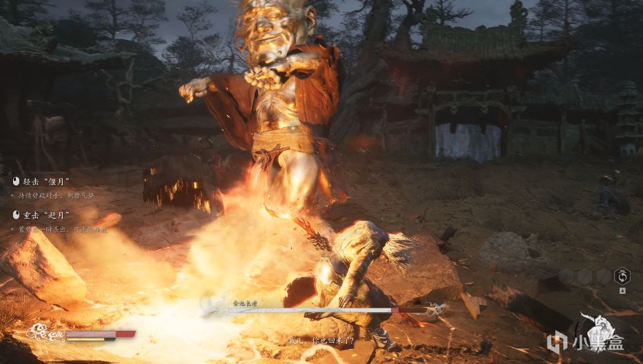 泰山壓頂:黑熊精高高跳起,或用敦實的背部、或用正面壓向天命人,此技能進攻間隙不一,需要玩家自行判斷翻滾時間。