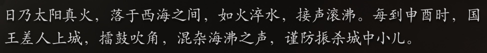 而落日鼓也让这一方百姓得以安居乐业,在这片土地上,太阳落下的时候会发出巨大的恐怖声响,会让小孩子被震死,在此之前,每到傍晚时分,沙大王都会派人去城墙上敲鼓吹角,以掩盖太阳的杂音,避免城中小孩子受到影响。