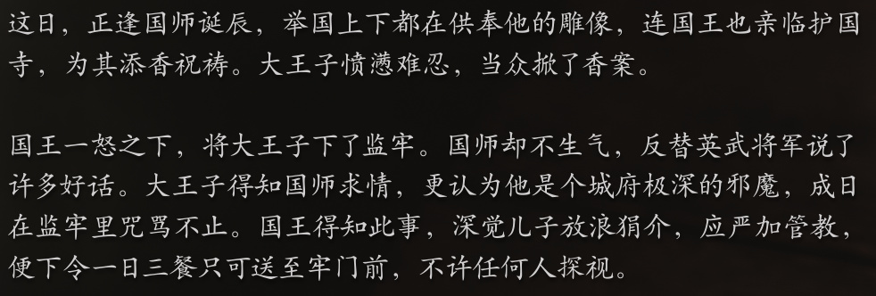大皇子选择忍耐,但是在国师寿辰那天他终于忍耐不住,愤懑地掀了香案,怒骂国师,却被沙大王下狱,关进了天牢。
