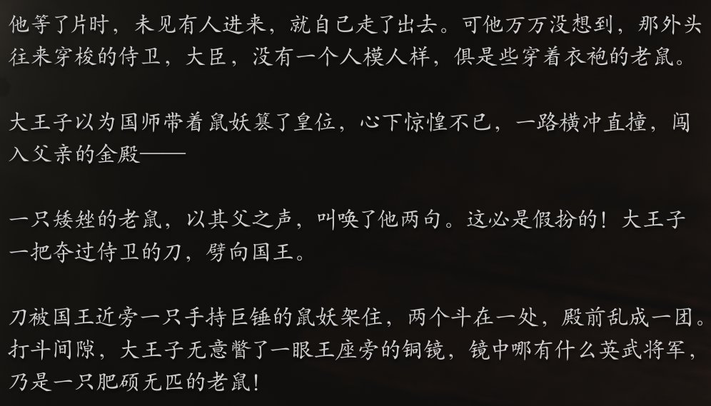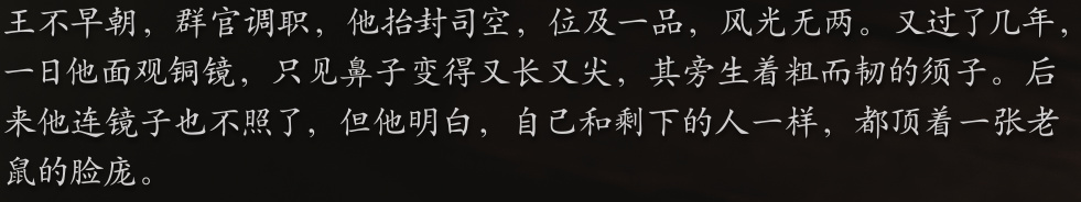 几年前,那些忠言劝谏沙大王的忠臣们,都以人类的身份死去了,而剩下的人,无论是胆小怕事的人也好,还是奸佞小人也罢,都要顶着一张肮脏丑陋的老鼠的脸,懦弱地苟活一辈子!