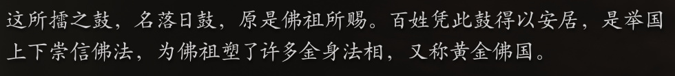 为了感谢佛祖赐下落日鼓保障自己的子女平安,流沙国的国民们自发地建立起了佛像金身,随处可见的佛像印证了这个国度内,佛教正在飞速传播。