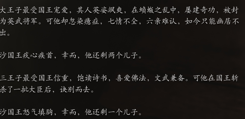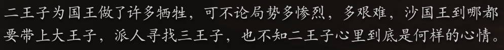 为了弥补对大皇子和三皇子的亏欠,沙大王去哪里都带着大皇子,并且追问三皇子的下落。