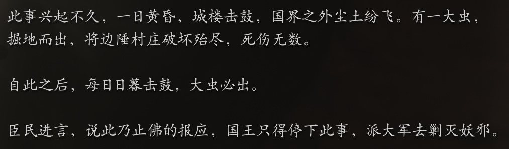 灭佛运动开始后,一只大虫降临在了国门外,每到日落时分击落日鼓的时候,就对流沙国发动攻击,仿佛在讽刺流沙国用着佛祖的落日鼓,却做出了灭佛这种忘恩负义的事情。