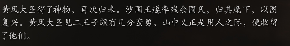 继续前行,天命人在一处洞窟内遇到了戌狗,接受他的委托杀死了沙河内的蛙妖,并且得到了一张【避凶药】的丹方,吃下这丹,妖邪便很难侵入,可以达到增强防御力的效果。