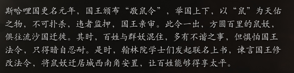 天命人隐隐约约听到前方有人交谈,原来是几只巡逻的鼠妖,在解决了巡逻的妖精后,天命人潜入了关塞内。